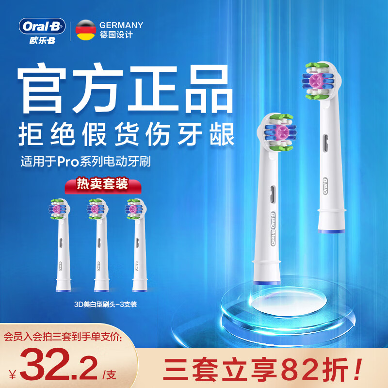 欧乐B电动牙刷头 成人美白型 3支装 EB18P-3 适配成人2D/3D全部型号 圆头【不适用iO系列】标准型软毛价格:119.00元!