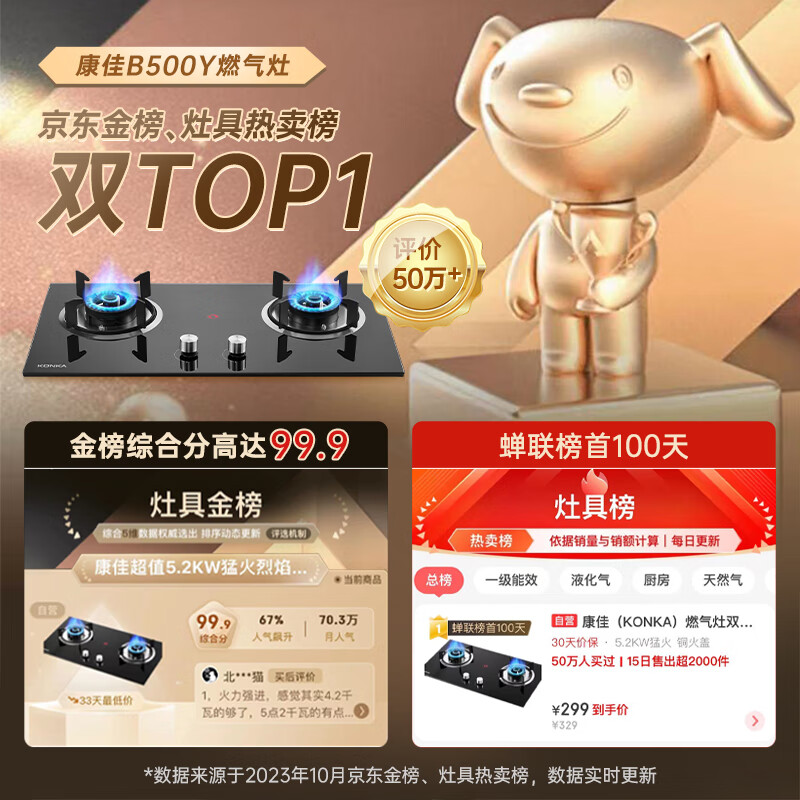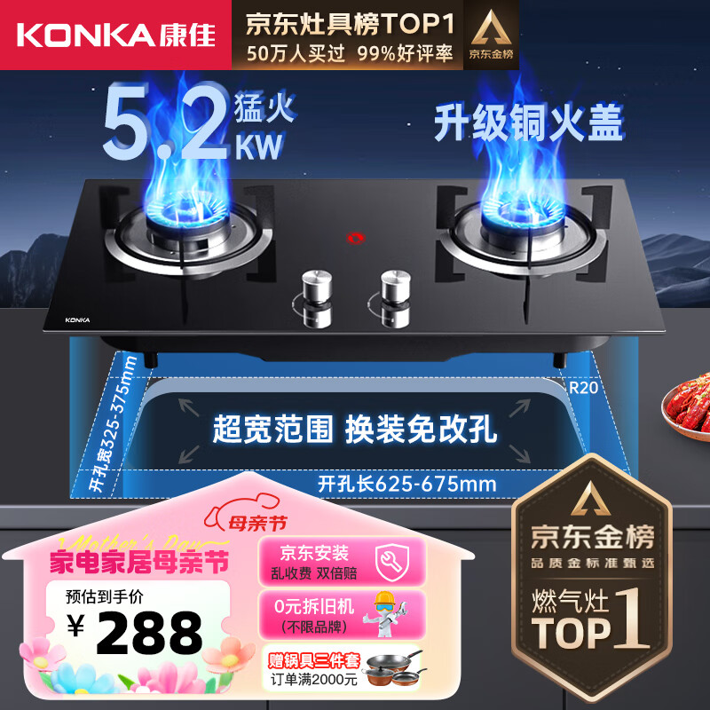 康佳(KONKA)燃气灶双灶家用天然气 5.2kW猛火灶具 台式嵌入式 钢化玻璃大火力灶台 JZT-B500Y(天然气)价格:288.00元!