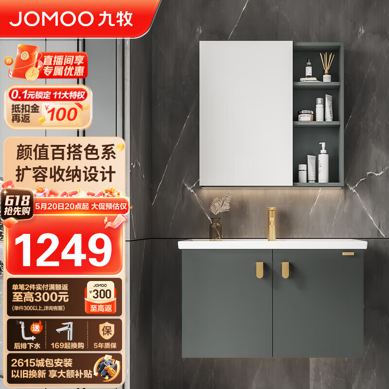 九牧(JOMOO)美妆浴室柜 陶瓷一体盆抗菌洗脸盆柜组合深灰70cm A2722-13AN-1价格:1649.00元!