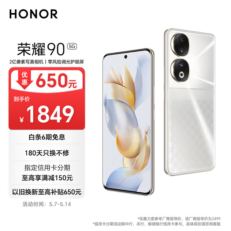 荣耀90 2亿像素超清相机 零风险调光护眼屏 5000mAh轻薄长续航 12GB+256GB 星钻银 5G价格:1849.00元!