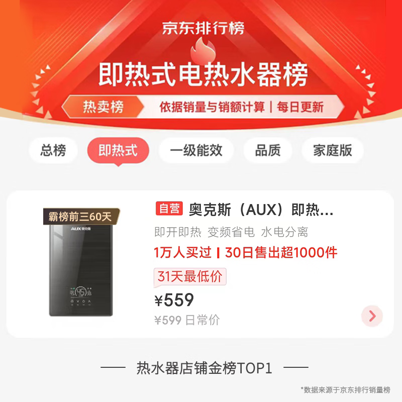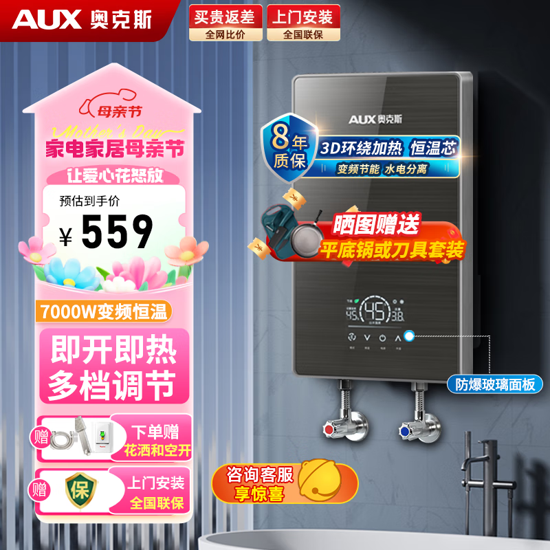 奥克斯(AUX)即热式电热水器电 速热智能变频多功率可调家用卫生间洗澡小型超薄热水宝即开即热恒温免储水 7000W 变频恒温+水电分离【升级银河灰】价格:559.00元!