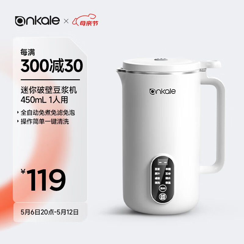 ankale破壁机 豆浆机 全自动免煮五谷杂粮 家用免洗小型1-2人破壁豆浆机 「优雅白」450mL价格:119.00元!