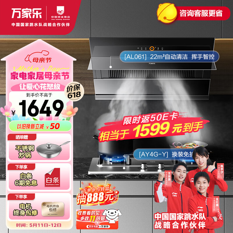 万家乐抽油烟机 烟灶套装 22立方侧吸式大吸力挥手自清洗不锈钢免扩孔燃气灶具套装AL061+AY4G液化气价格:1849.00元!