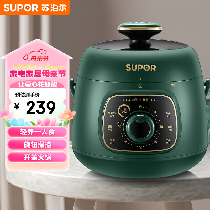 苏泊尔(SUPOR)一人食迷你电锅1.8L开盖火锅家用智能旋钮面板煲汤煮粥复古绿易清洁SY-18YA9061高压锅(1-2人)价格:239.00元!