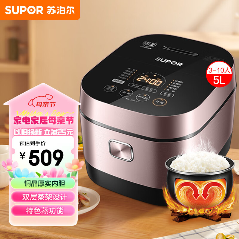 苏泊尔(SUPOR)电饭锅柴火饭5L大容量IH电磁加热精铁球釜3-10人双蒸架童锁家用智能预约电饭煲50HC750价格:498.00元!