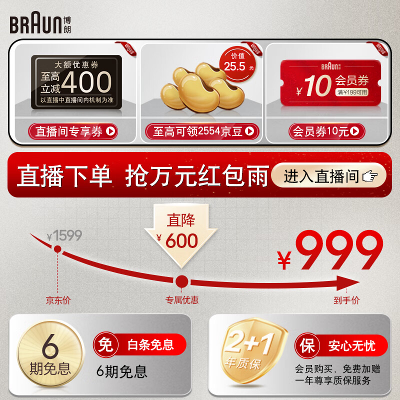 3、心心念念的想买个博朗剃须刀,这次终于实现,感受到了博朗的魅力,动力强劲,充好电,赶紧试用了一下,确实好用啊,本人胡须比较少,几次就刮干净了,这次买对了,很开心!