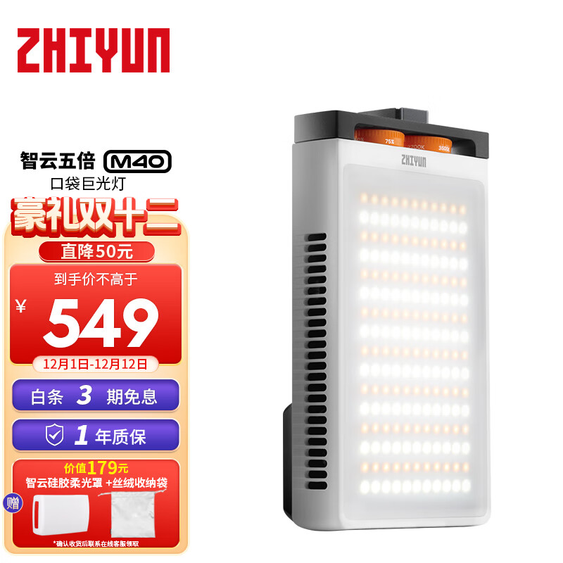 智云(zhi yun)五倍手持led补光灯摄影灯视频直播室内婚庆高功率便携口袋柔光灯M40价格:549.00元!