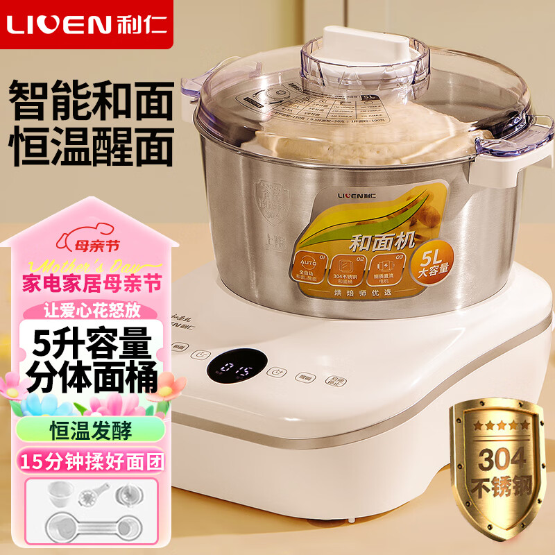 利仁(Liven)和面机家用揉面机厨师机多功能智能醒面机料理机全自动活面搅面机面包面粉搅拌机5升 HMJ-D5036价格:319.00元!