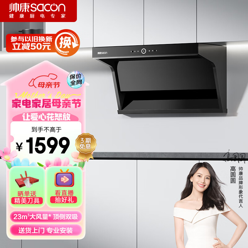 帅康(Sacon)抽油烟机顶侧双吸油烟机 家用23大风量7字机 挥手智控 自动清洗 Y8272价格:1599.00元!