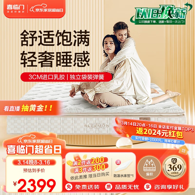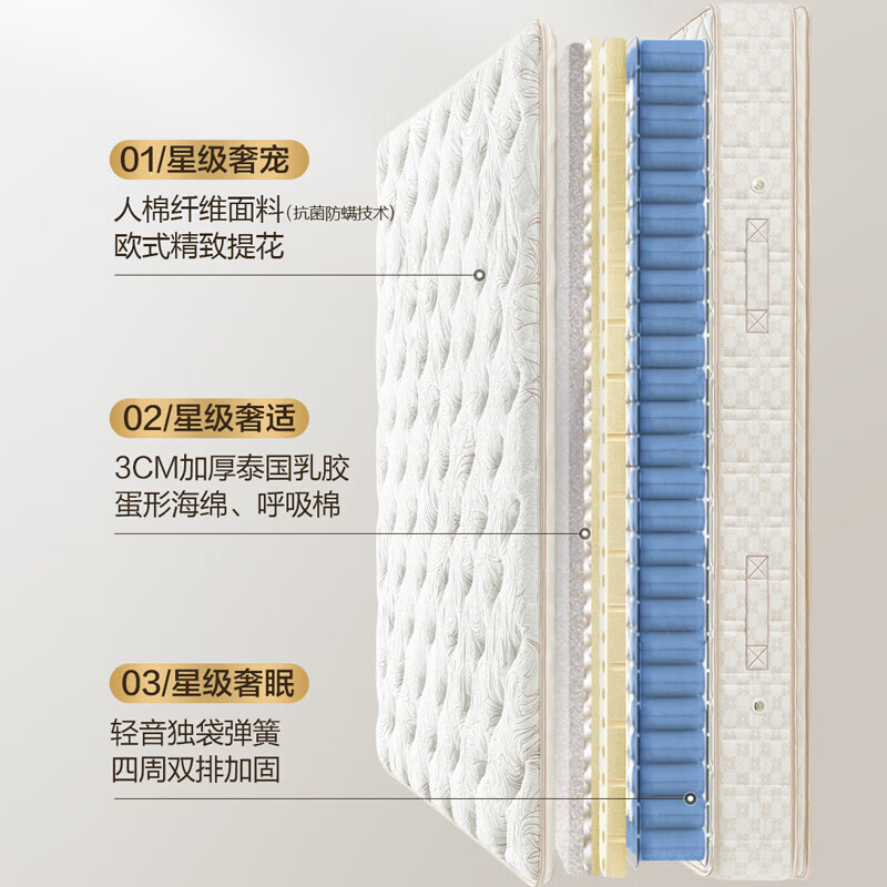 喜临门抑菌防螨3cm高纯乳胶床垫 独袋弹簧席梦思床垫 舒缦3.0 1.5x2米价格:2399.00元!