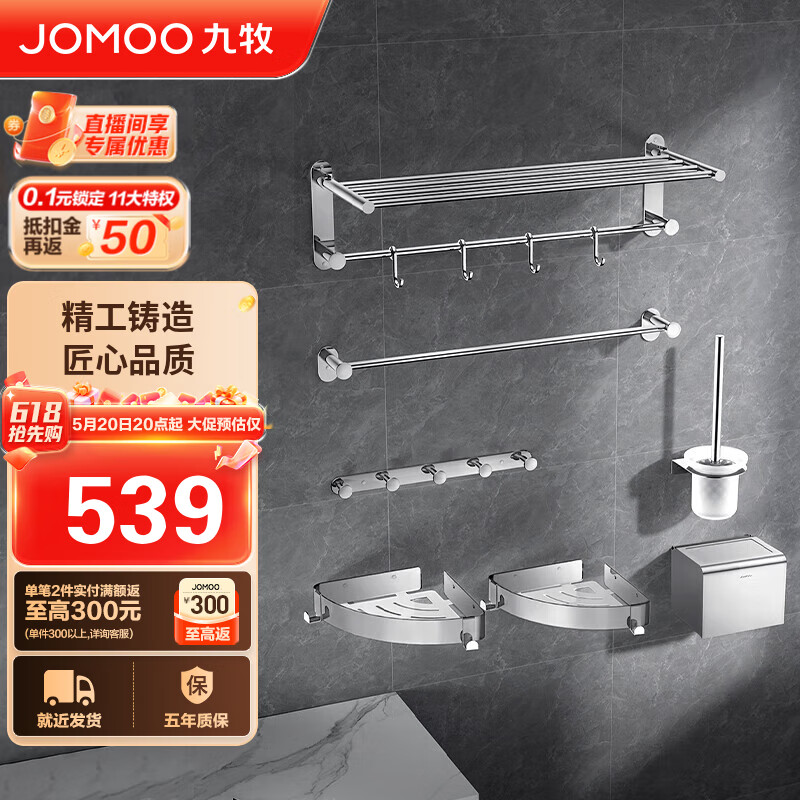 九牧(JOMOO)毛巾架浴室卫生间置物架免打孔浴巾架304不锈钢挂件套装 9300750价格:639.00元!