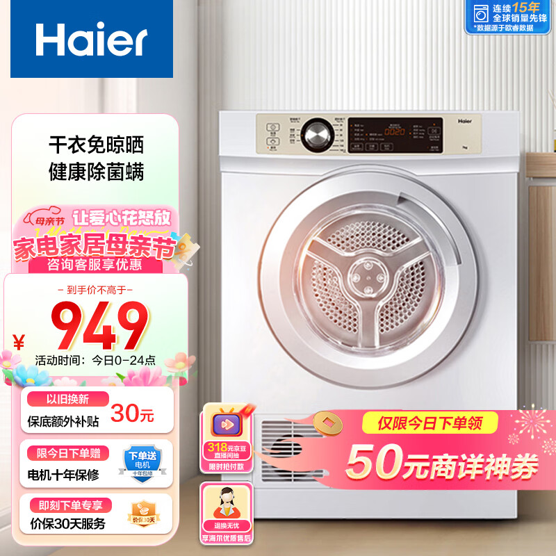 海尔(Haier)烘干机家用 7公斤直排小型干衣机 除菌除螨除潮 速烘节能 衣干即停 防皱 EGDZE7F 以旧换新价格:999.00元!