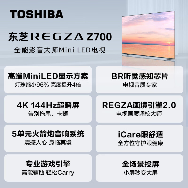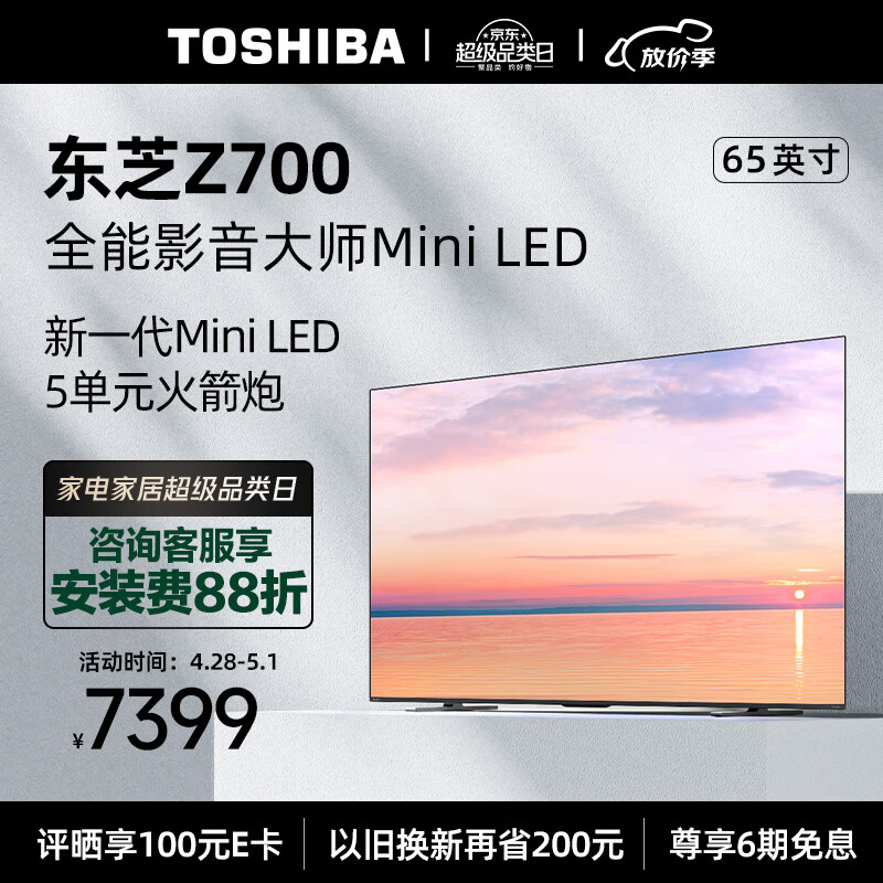 东芝电视65Z700MF 65英寸 7系高端Mini LED 4K144Hz高刷 65w火箭炮音响 液晶平板游戏电视机 以旧换新价格:7399.00元!