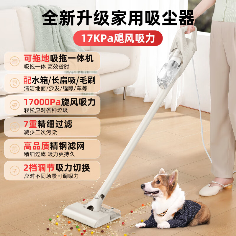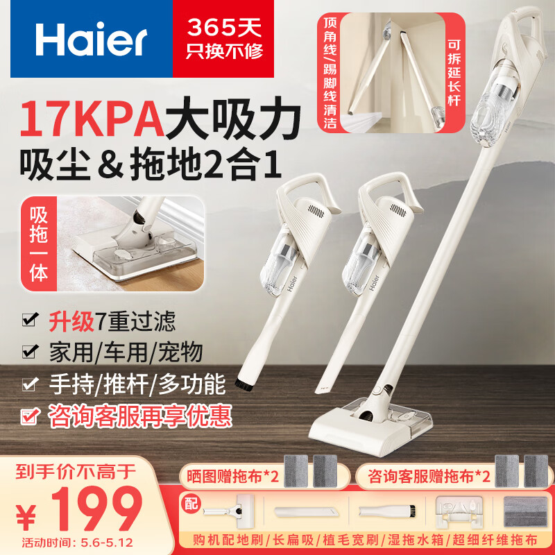 海尔(Haier)吸尘器家用宠物拖地除尘机小型轻音大吸力大功率轻机身吸尘机湿拖吸拖一体HZG-Q29W价格:198.00元!