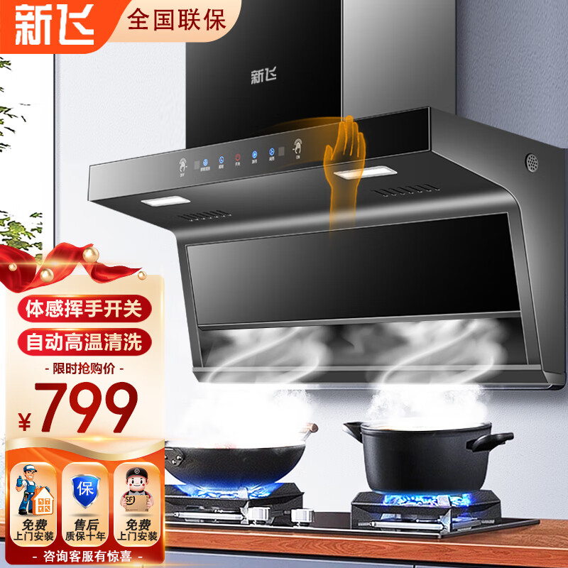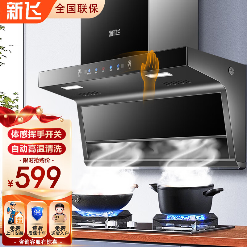 新飞顶侧双吸油烟机7字型抽油烟机900宽家用19立方一级能效五健体感自动清洗厨房橱柜烟机CXW-320-C02价格:599.00元!