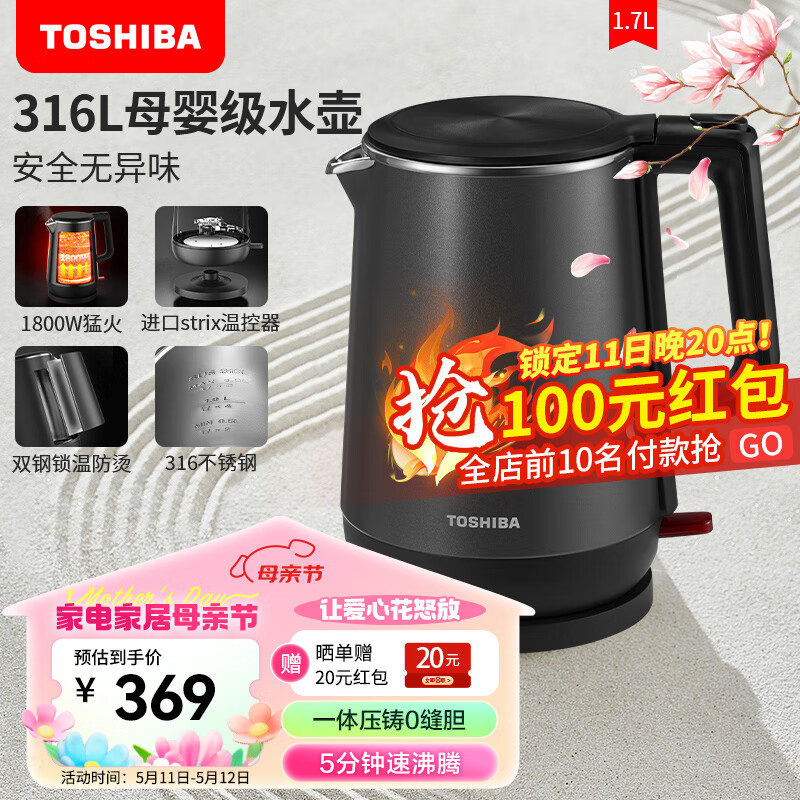 东芝(TOSHIBA)防烫烧水壶电热水壶电水壶316L不锈钢内胆1.7升大容量温控煮水壶开水壶KT-17DRTC价格:369.00元!