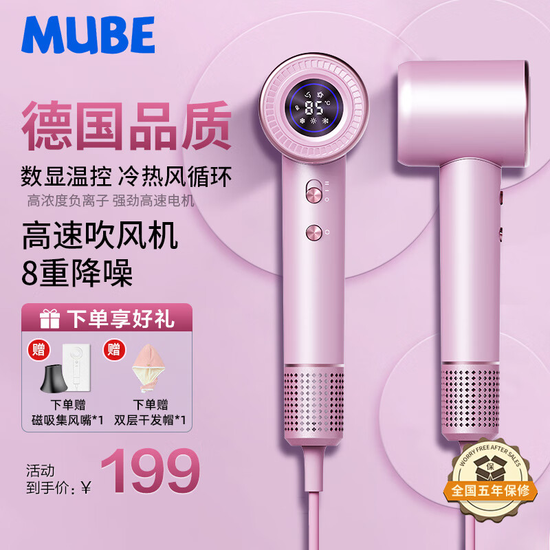 MUBE高速护发吹风机家用静音负离子大功率不伤发电吹风亿级负离子吹风筒恒温大风力速干低噪 GF-02樱花粉礼盒款【30秒速干/6亿滋养负离子价格:345.00元!