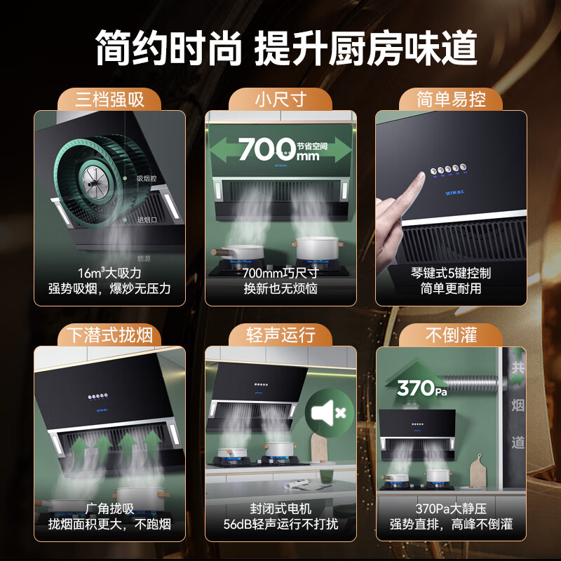 5、外观大气,吸力很大,做饭时厨房不关推拉门,外面也闻不到味道。噪音略大,不过可以接受,吸力大风压大,声音肯定会大一点,整体体验感很好,很满意!