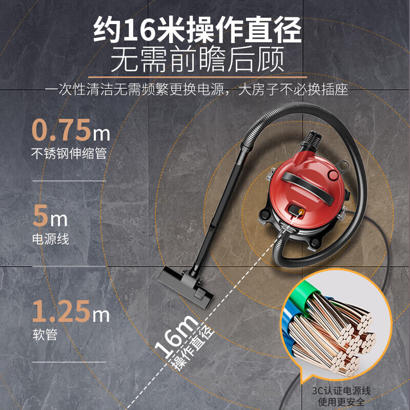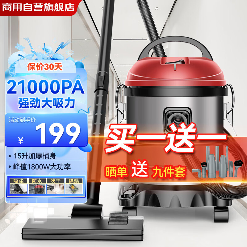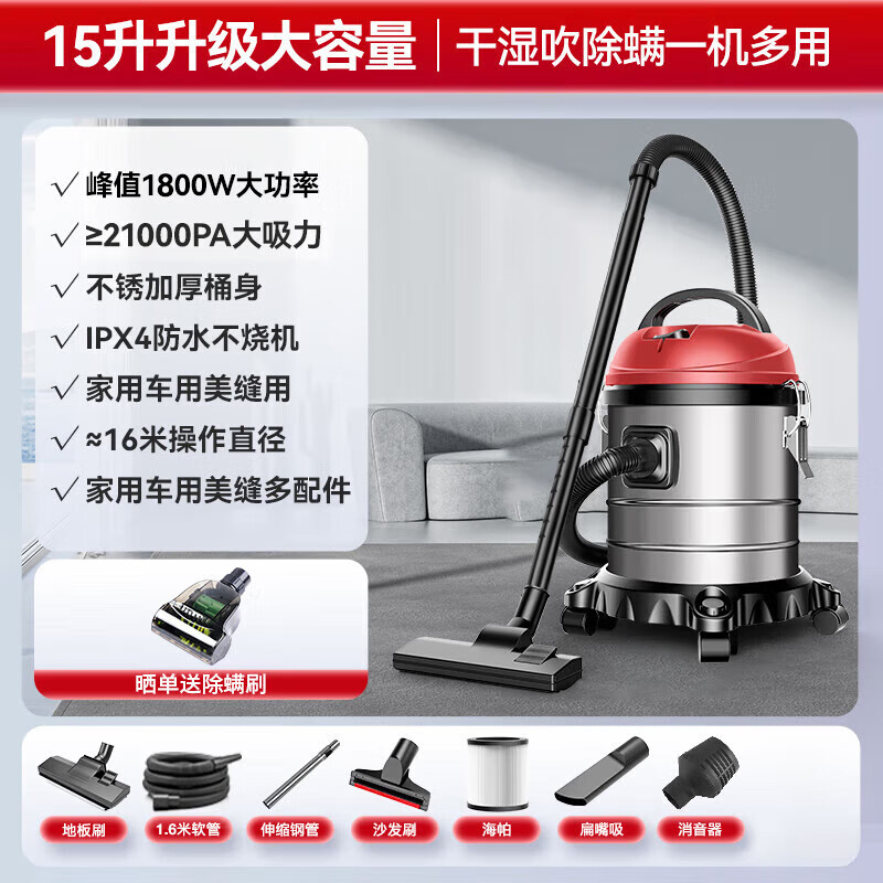扬子吸尘器家用1800W大功率装修美缝开荒车用商用工业强力桶式吸尘机工厂酒店用车载吸尘器15升大容量价格:199.00元!