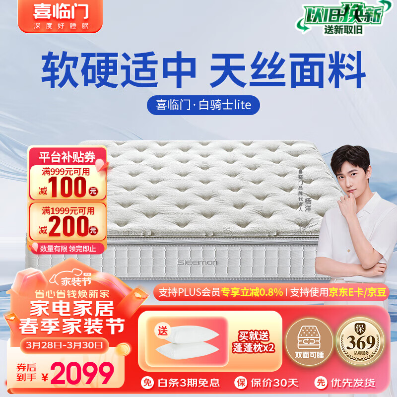 喜临门2CM记忆海绵床垫 独立弹簧席梦思软硬适中 白骑士lite 1.5x2米价格:2299.00元!