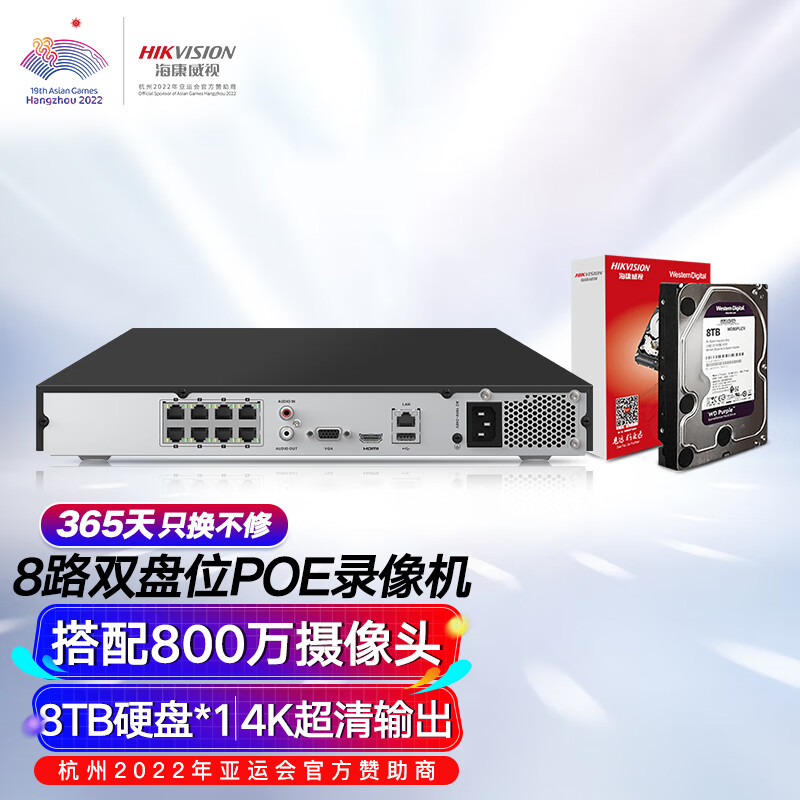海康威视网络硬盘录像机监控8路POE网线供电NVR满配8个摄像头带8T硬盘DS-7808N-R2/8P价格:3012.00元!