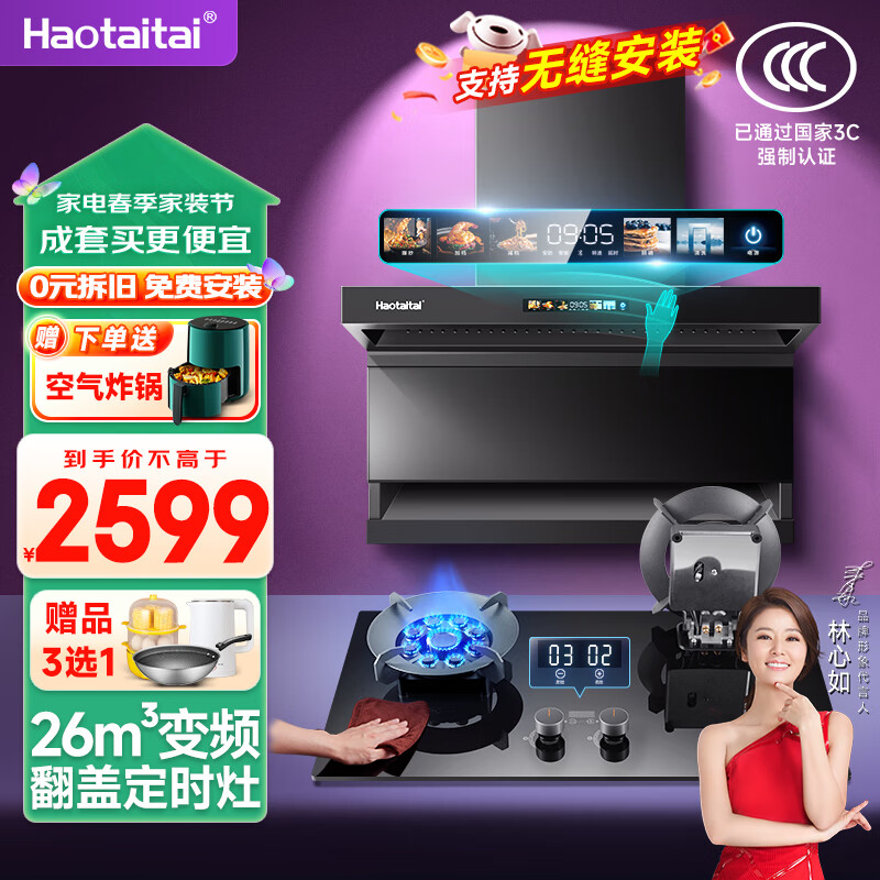 Haotaitai油烟机 顶侧双吸烟灶套装FJ9BP变频静音大吸力抽油烟机+M2九头翻盖猛火燃气灶具套装价格:3099.00元!