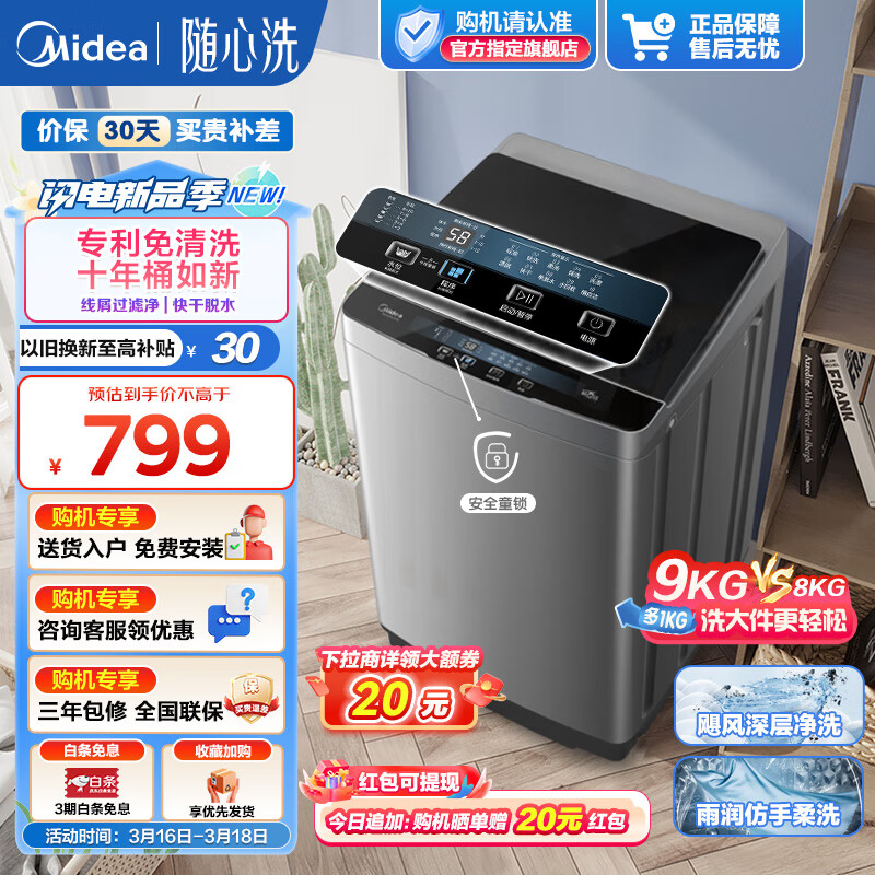 美的(Midea)洗衣机波轮全自动9公斤大容量升级 专利免清洗十年桶如新 智能三水位 宿舍租房家用家电 MB90VJ58E价格:799.00元!