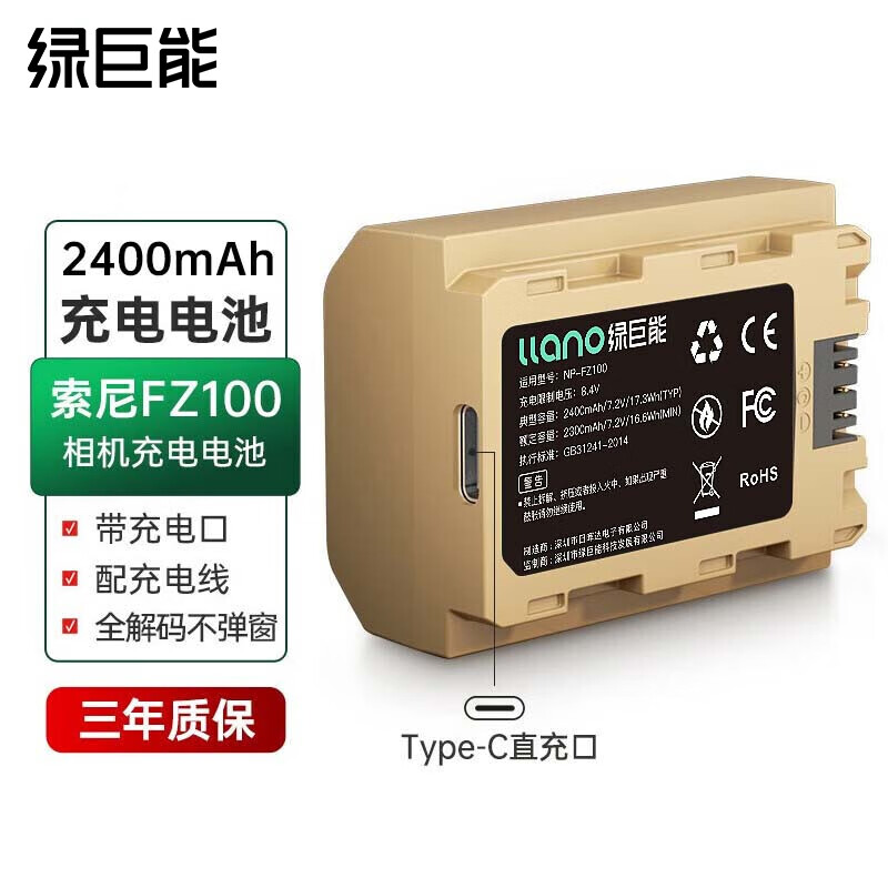 绿巨能(llano)索尼FZ100相机电池a7m3直充电池a9/a7r3/a7s3/a7m4/a6600微单单反电池Type-C接口2400mAh价格:249.00元!