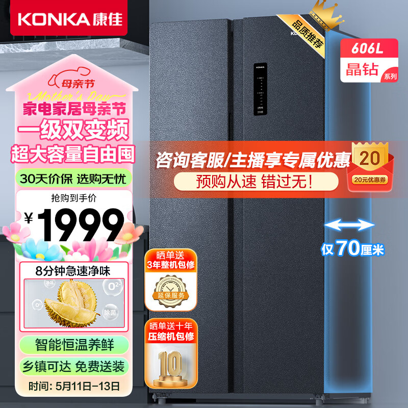 康佳606升双变频一级能效超大容量超薄冰箱风冷无霜双循环对开双开门家用电冰箱BCD-606WEGQ5SP价格:1999.00元!