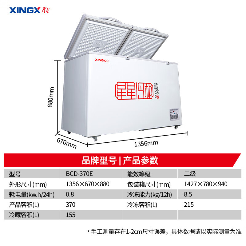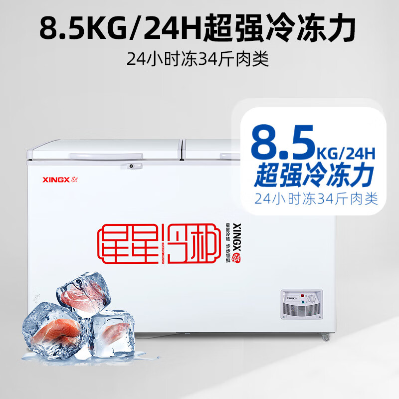 星星(XINGX) 370升 商用卧式冰柜 左冷冻右冷藏 卧式冰箱 顶开门双温双箱冷柜 BCD-370E价格:2099.00元!