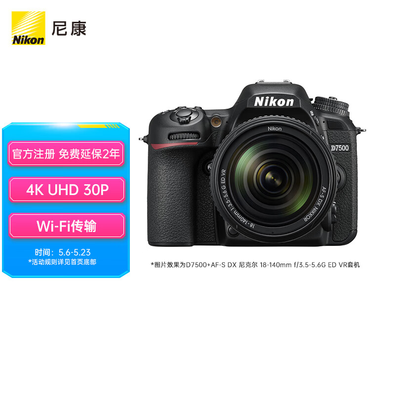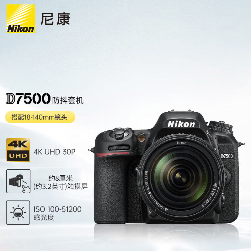尼康(Nikon)D7500 单反相机 数码相机 (AF-S DX 尼克尔 18-140mm f/3.5-5.6G ED VR 单反镜头)价格:7099.00元!