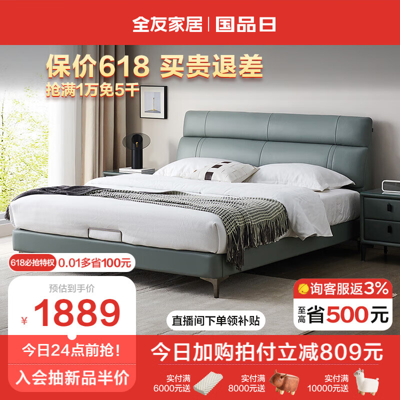 全友家居 真皮床 头层牛皮现代简约主卧室双人皮艺软包大床轻奢105251价格:2698.57元!