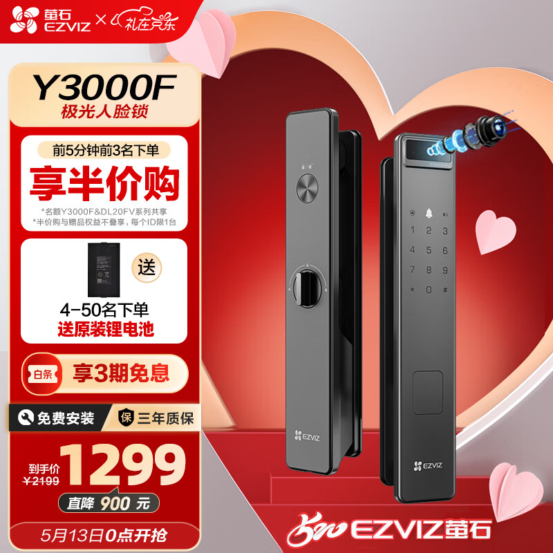 萤石Y3000F极光人脸锁 灰 3D人脸识别无需指纹 家用全自动智能电子密码锁 C级锁芯防盗电子门锁价格:1299.00元!