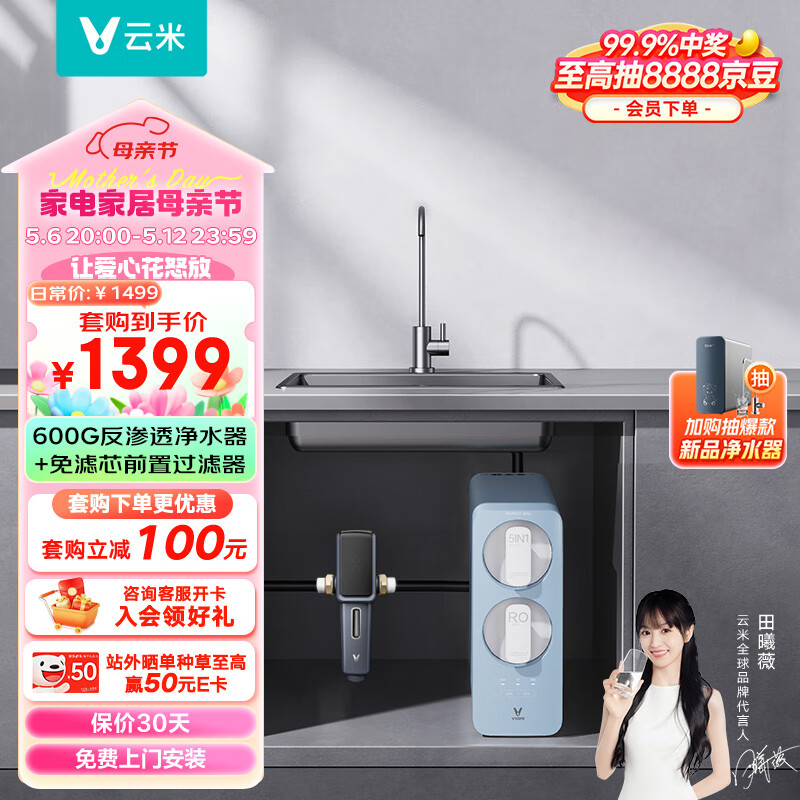 云米(VIOMI)小蓝调600G全屋净水套装净水器+前置过滤器VF4两件套家用直饮净水器净水机价格:1499.00元!