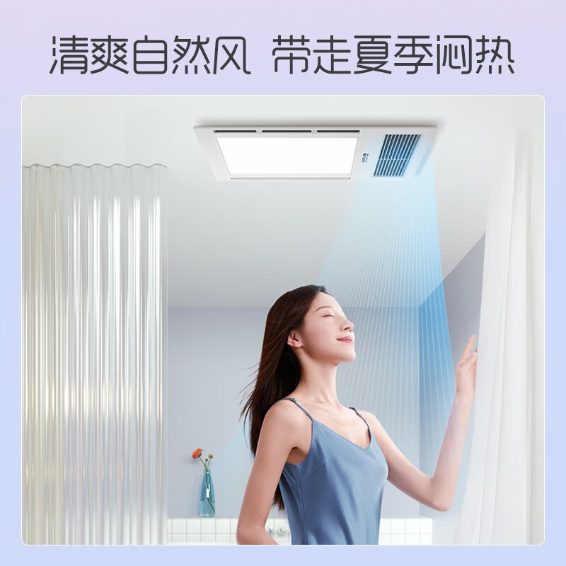 5、2600W翘板开关,两档暖风+自然吹风。有清新换气功能,LED照明,无频闪。机身厚度11CM,整机防潮防水。外观漂亮。
