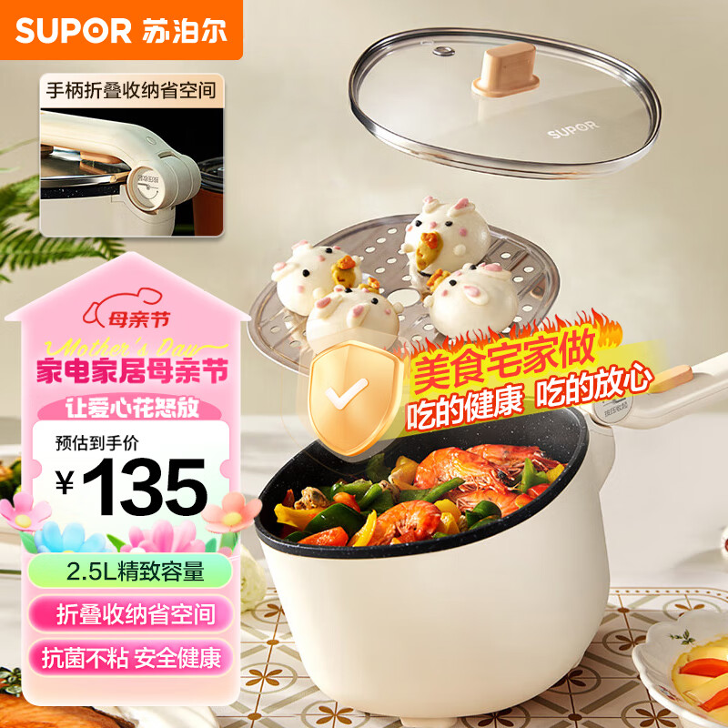 苏泊尔(SUPOR)电炒锅 便携式电煮锅电热锅 多功能宿舍泡面锅电火锅 旅行出差折叠式把手2.5L多用途锅CJ20A819价格:135.00元!