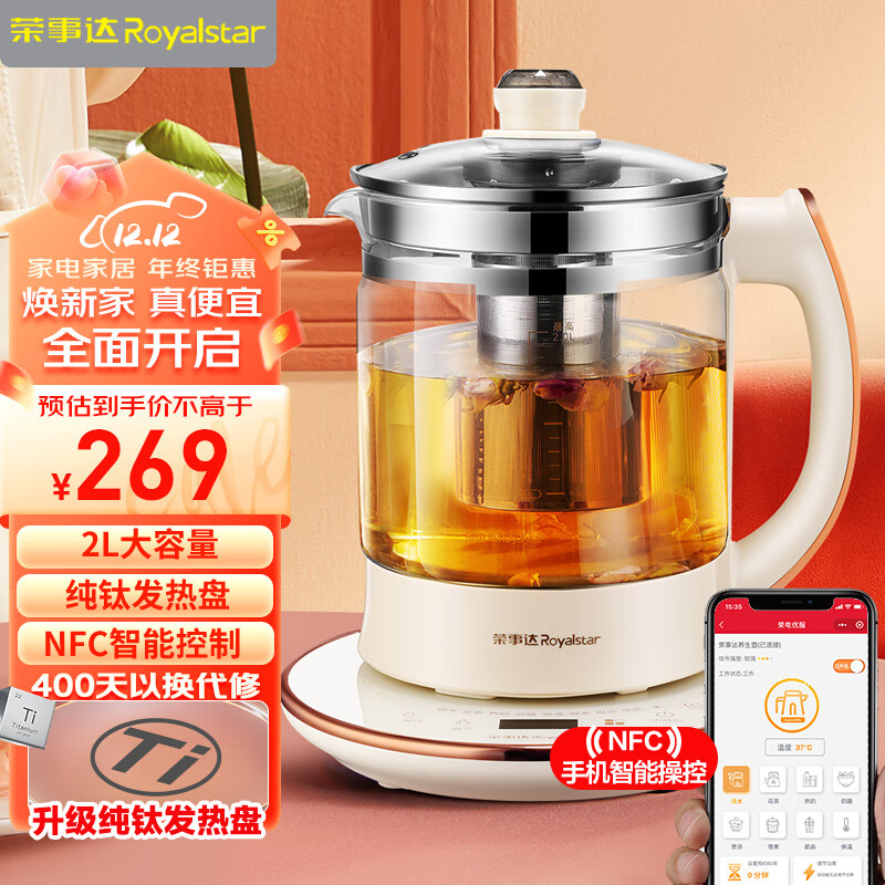 荣事达(Royalstar)养生壶 烧水壶煮茶器电热水壶2L纯钛加热盘抗异味恒温玻璃花茶壶电水壶【NFC蓝牙控制】YSH2002价格:289.00元!
