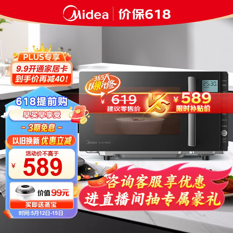 美的(Midea)微碳系列 900W变频家用微波炉 智能微烤一体机 湿度感应 23L一级能效(PC23M6W)价格:589.00元!