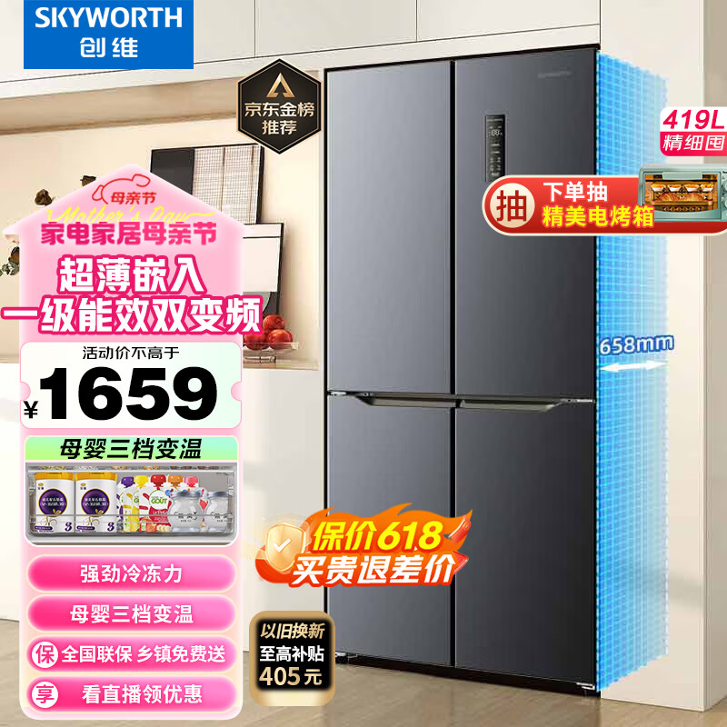 创维(SKYWORTH)四维鲜净419升风冷十字对开门四开门家用电冰箱一级能效变频超薄嵌入BCD-419WXPS(N)价格:1659.00元!
