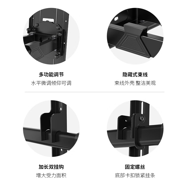 3、商品还是比较满意的,一次不错的购物体验,有需要还会回购。看评论的老铁,请理性参考,评论区评论。重点来了,品质有待提升,三个人安装的,挂电视这一步,不是很好操作,调节角度也比较麻烦。