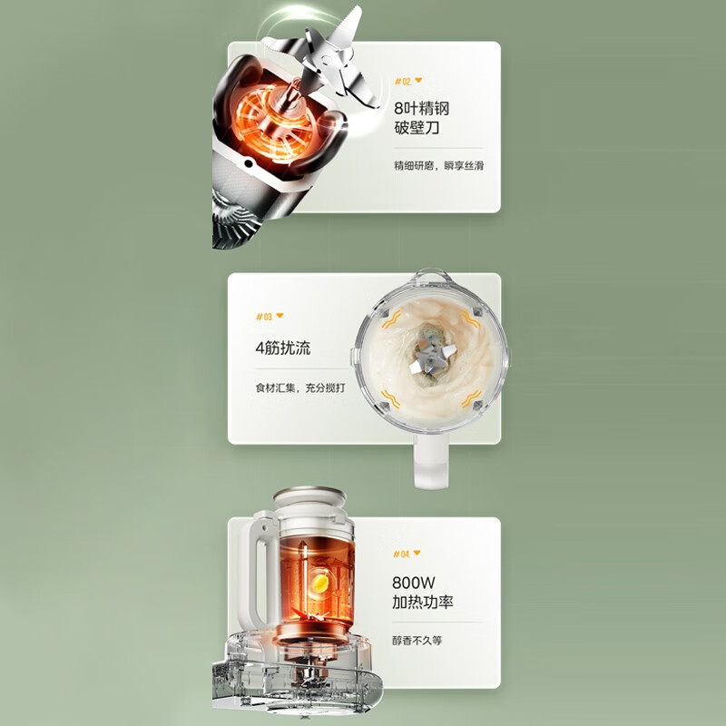 2、外观外形:颜色美观,材质还不错预约定时:可以预约,时间可调声音大小:用上隔音罩声音还是要小些打磨口感:豆浆口感细腻,挺好喝的动力大小:这个动力足够了,刀片还是8叶的产品功能:常用功能基本都具备了