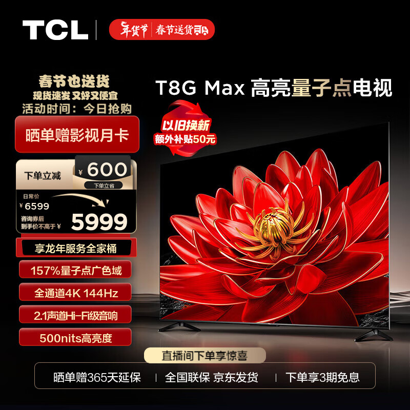 TCL电视 85T8G Max 85英寸 QLED量子点 4K 144Hz 2.1声道音响 超清巨幕屏 液晶智能平板电视 85英寸 官方标配价格:6599.00元!