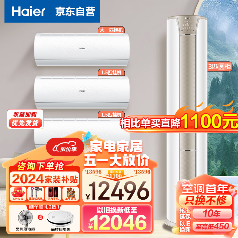 海尔(Haier)三室一厅空调套装 新一级能效变频冷暖空调 大1匹+1.5匹*2+3匹空调 WiFi智控 光感睡眠 以旧换新价格:12396.00元!