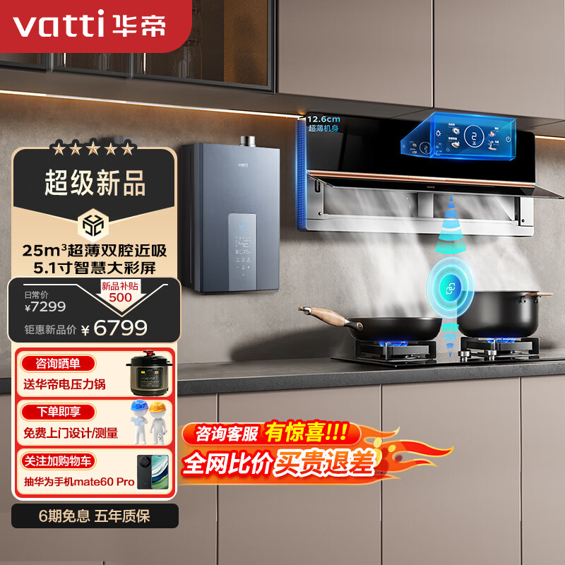 华帝(VATTI)抽油烟机变频超薄近吸双腔25风量油烟机灶具热水器家用厨房多件套i111X6S+100B+254-16(天然气)价格:7299.00元!