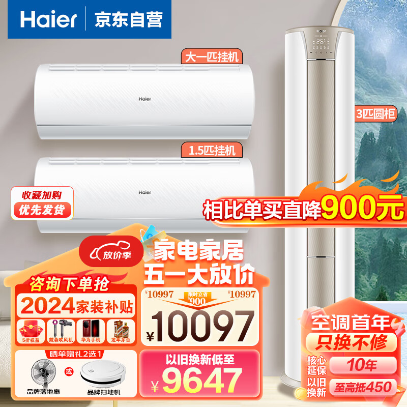 海尔(Haier)两室一厅空调套装 新一级能效变频冷暖空调 大1匹+1.5匹+3匹空调 WiFi智控 光感睡眠 以旧换新价格:10007.00元!