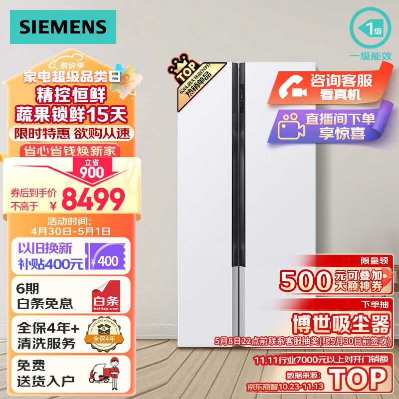 西门子(SIEMENS) 630升精控恒鲜一级能效变频冰箱双开门对开门家用大容量白色以旧换新630W(KX63EA20TI)价格:9899.00元!