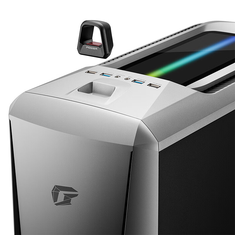3、机箱很漂亮!灯亮起来之后很2077!这个开机键设计的有点意思,拿下来也不会关机,很喜欢!自己买了个1t的m2ssd插上去,我能说我找插口找了半天么?插上!盖上盖!开机!点亮!开始搞机!很舒服!