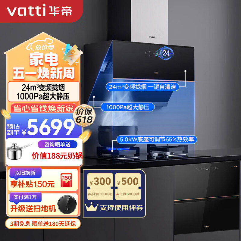 华帝(VATTI)抽油烟机旗舰机王侧吸式变频油烟机燃气灶具消毒柜家用厨房三件套i11193+72B+3040(天然气)价格:5699.00元!