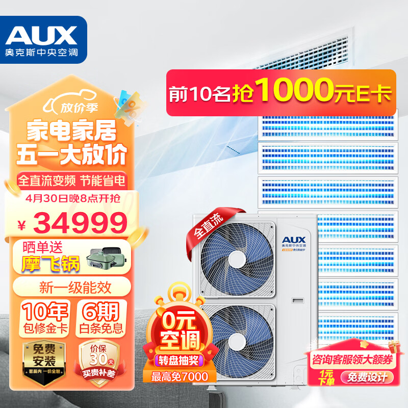 奥克斯(AUX)中央空调7匹一拖七家用多联风管机全直流一级变频包安装嵌入式空调适用六室一厅DLR-180W/DCJ2S-JM价格:34999.00元!