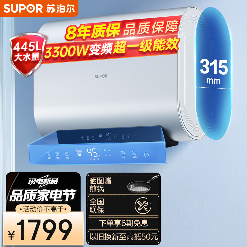苏泊尔(SUPOR)扁桶双胆60L家用电热水器储水式 超薄机身3300w变频速热 一级能效节能省空间 E60-DR67价格:1799.00元!